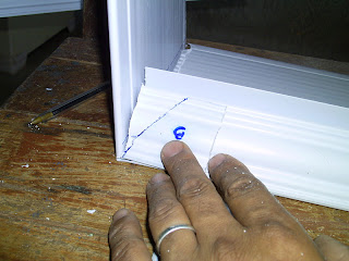Agora deveremos fazer o corte em diagonal, essa talvez seja a parte mais complicada de nosso mini armario pois esse detalhe é super importante para que a nossa parte frontal fique bem apresentada,lembrando que já existem acabamento de cantos proprio pra essa situação, por aqui onde moro ainda não tem mas ja ví pra vender no mercao livre, se voçe não achar perto de sua casa , procure no mercado livre pela peça :finalização dos cantos da moldura, ou clic neste link:http://produto.mercadolivre.com.br/MLB-208765029-finalizaco-dos-cantos-da-moldura-para-forro-de-pvc-_JM não tenho conhecimento se ja existem próprios para esse modelo apresentado aqui.